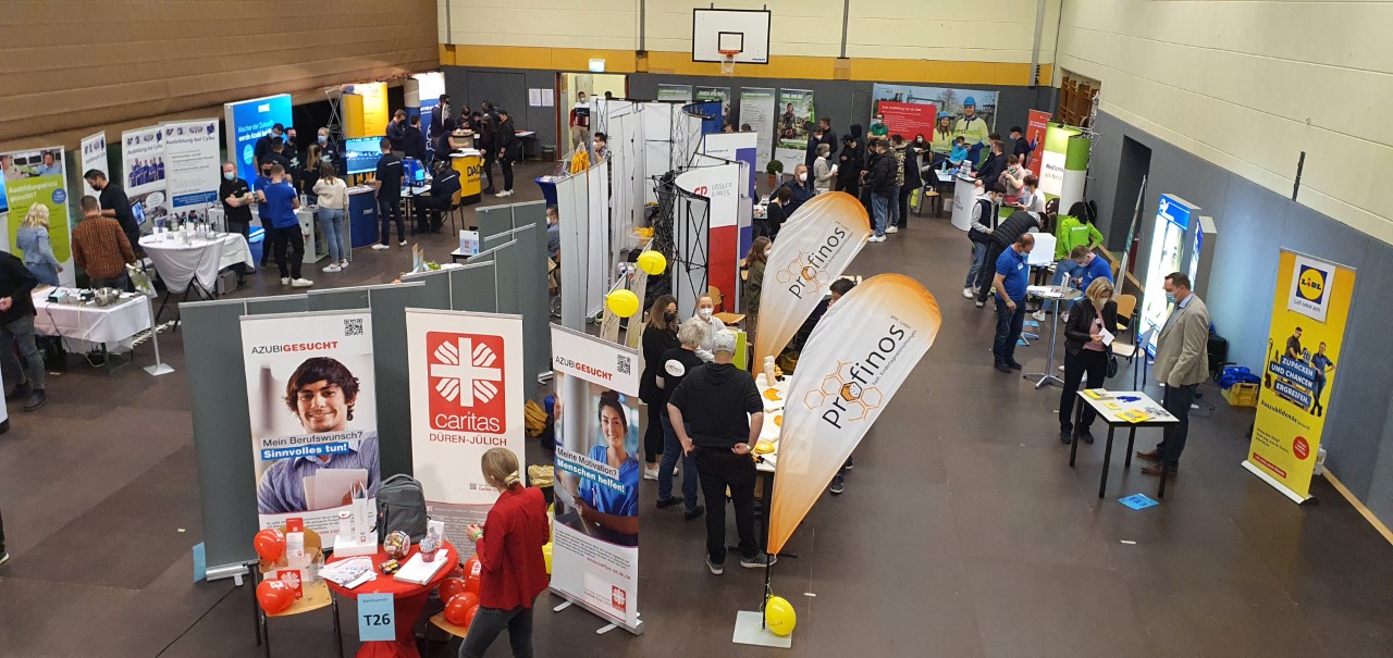 Schüler:innen aus der gesamten Region nach zwei Corona-Jahren konnten endlich wieder eine Live-Veranstaltung zur Berufsorientierung besuchen: auf dem Berufsinfo-Markt im Berufskolleg Jülich präsentierten sich 64 Unternehmen und öffentliche Einrichtungen und traten in den unmittelbaren Austausch mit den zukünftigen Auszubildenden, um mit ihnen Fragen bezüglich der individuellen beruflichen Zukunft zu klären.